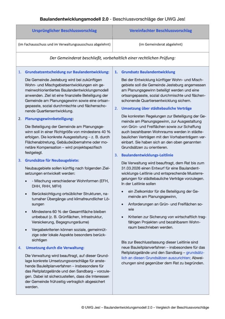 Am 10. Dezember 2025 hat der Gemeinderat Jesteburg unseren Antrag zur Einführung eines gemeinwohlorientierten Baulandentwicklungsmodells („Baulandmodell 2.0“) abgelehnt.